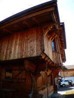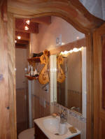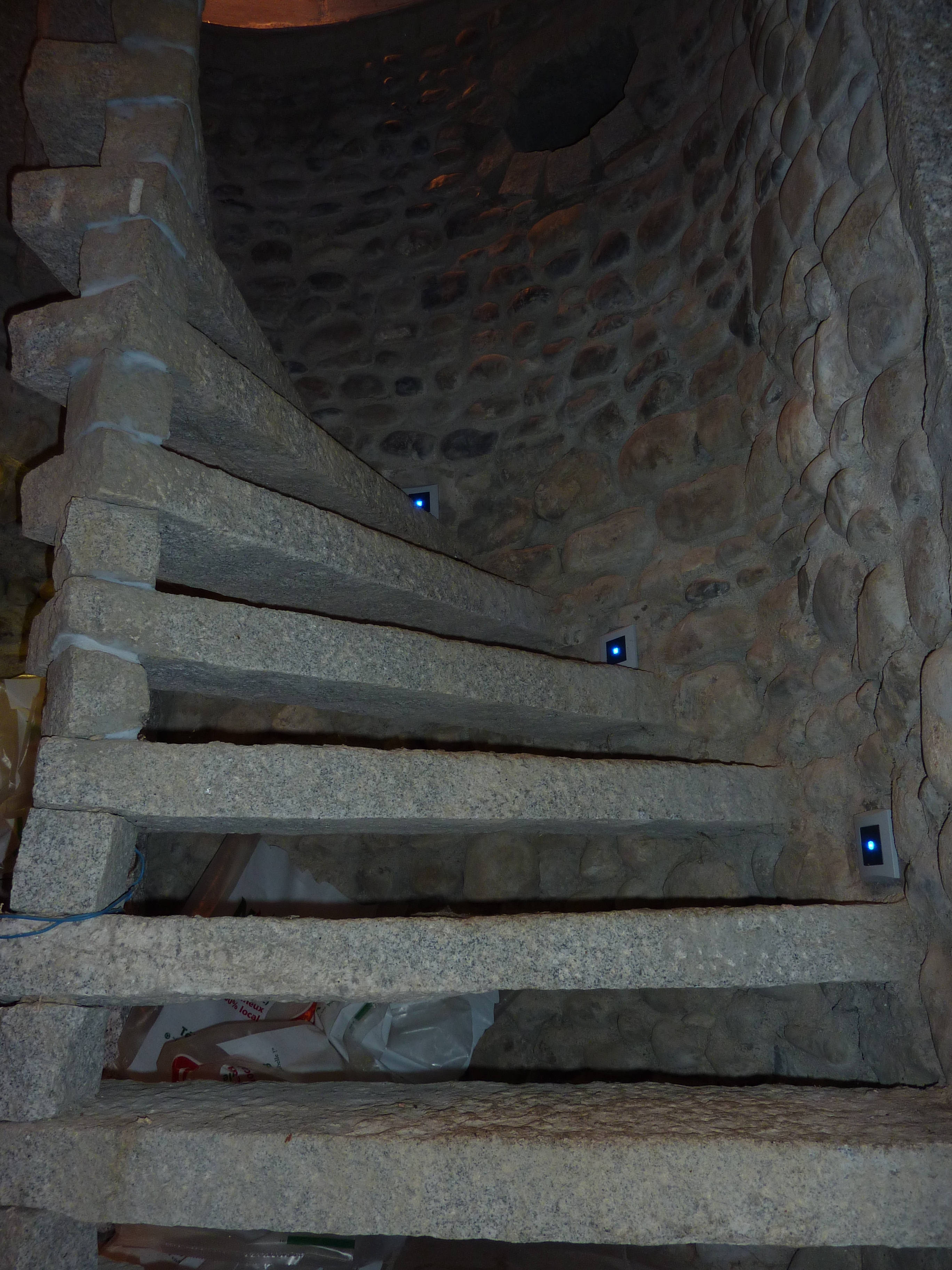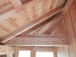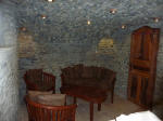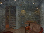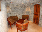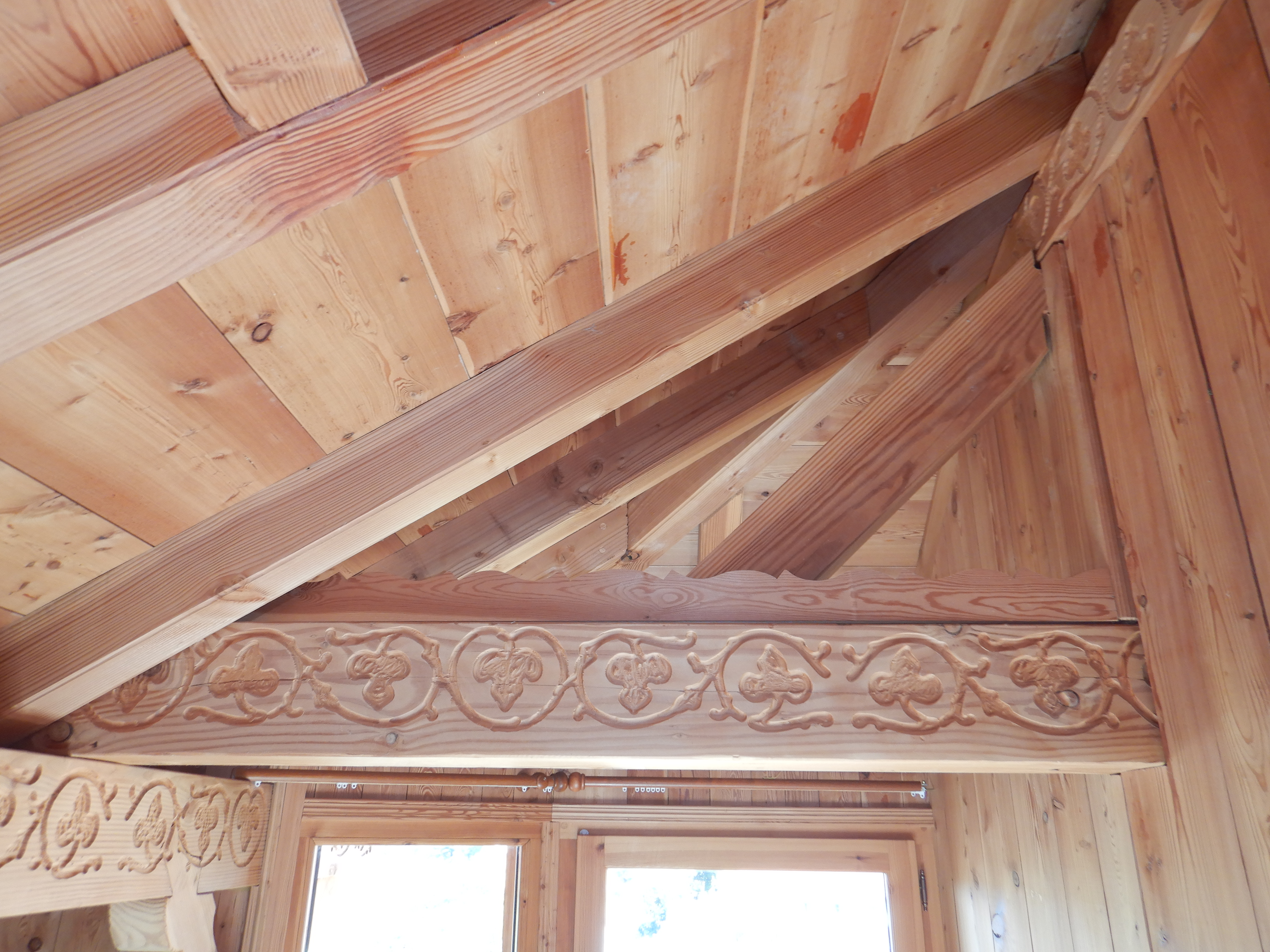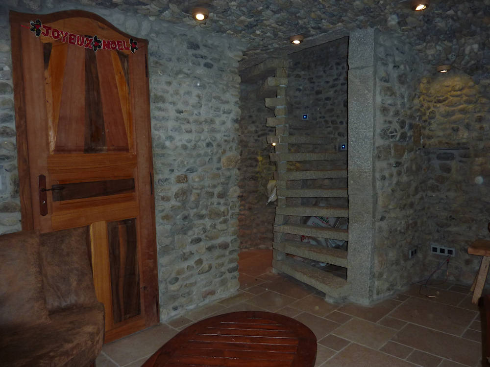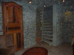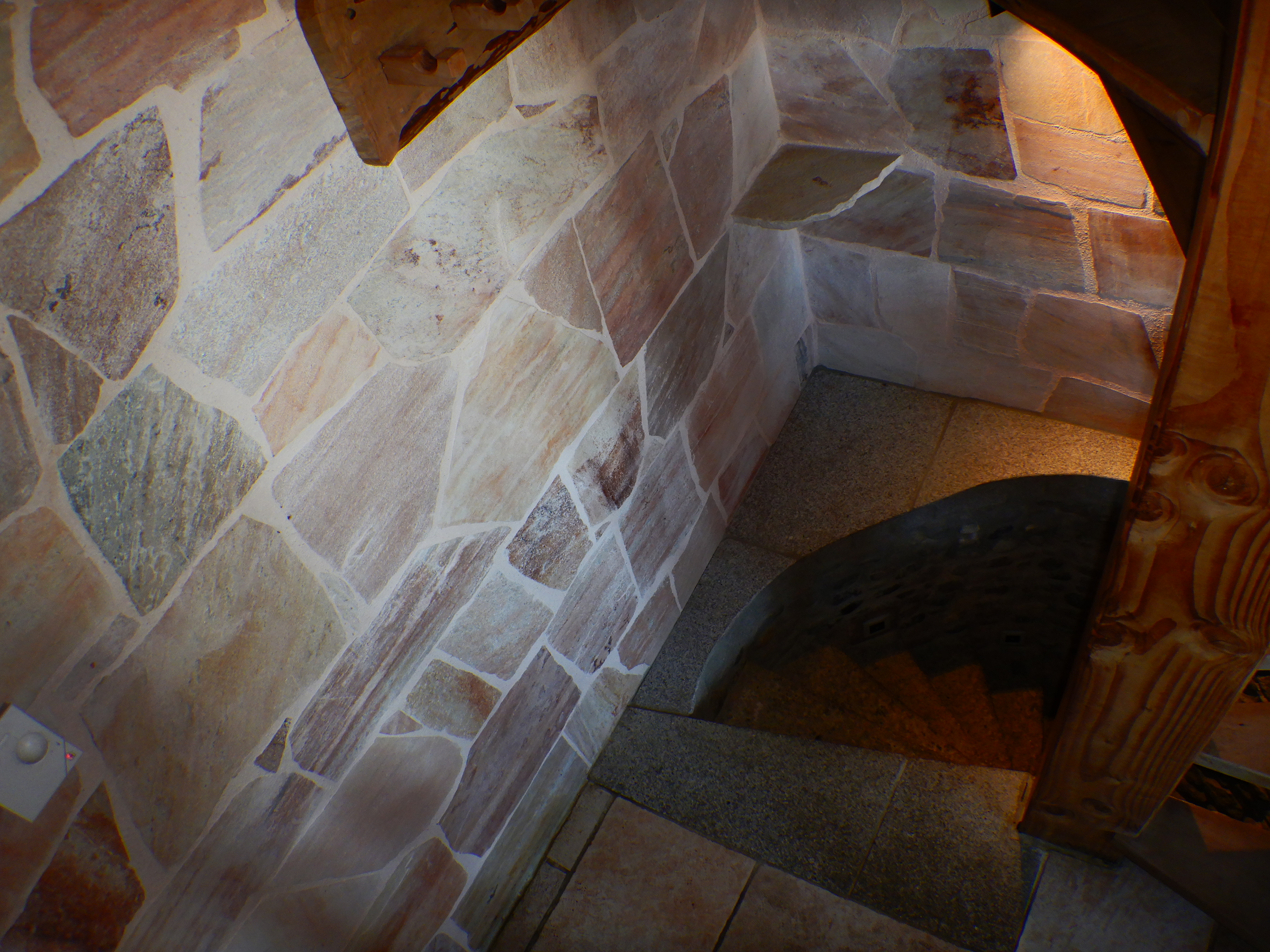 Il est décoré et sculpté, les murs du bas sont en pierre naturelle apparente.